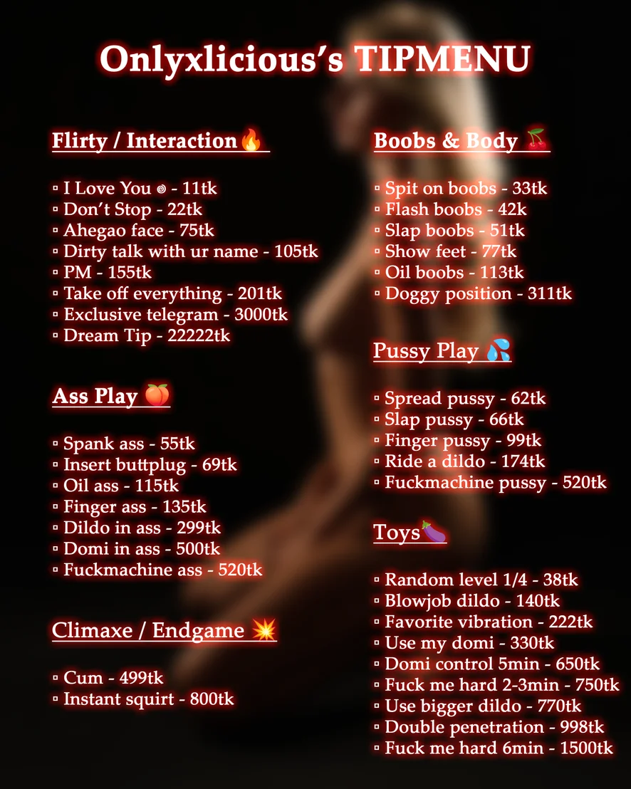 Ahegao, Anaal, Anale speeltjes, Pijpen, Pik beoordeling, Dubbele penetratie, Deepthroat, Dildo of vibrator, Op z'n Hondjes, Dirty Talk, Vingeren, Flashing, Voetfetisj, Gape, Handjob, Fisten, Kont naar mond, Kokhalzen, Masturberen, Olie show, Seksspeeltjes, Spanking, Squirten, Topless